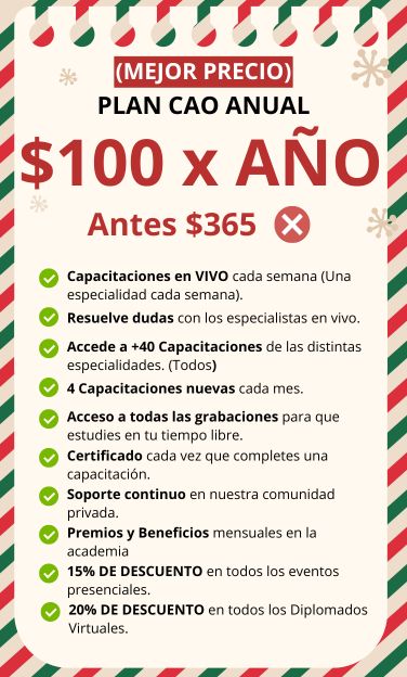 La membresía anual incluye 365 días de acceso a Capacitaciones en vivo cada semana en distintas especialidades, resolución de dudas con especialista en vivo, acceso a +17 capacitaciones de las distintas especialidades, las grabaciones de todos los capacitaciones dictadas en vivo, descuento del 20% de descuento en los Diplomados Virtuales y 15% en eventos presenciales.